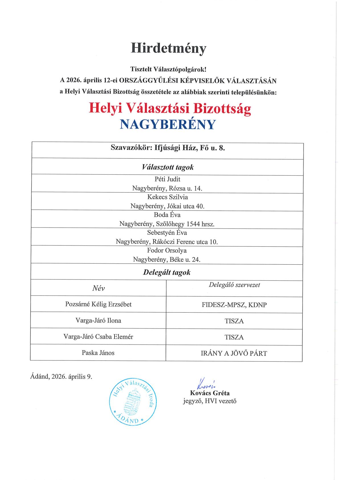 Képviselők: Ágicsné Kövesdi Friderika Kárász Katalin Magyarósi András (Szociális bizottság elnöke) Magyarósi János Szentpéteri László (Ügyrendi és jogi bizottság elnöke)